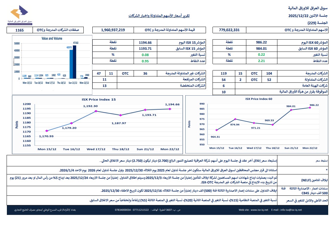 سجل سوق العراق للأوراق المالية، خلال جلسة الاثنين الموافق 22 كانون الأول 2025، استقراراً نسبياً في مؤشريه الرئيسيين، وسط تداولات متوسطة وارتفاع محدود في عدد الأسهم ....