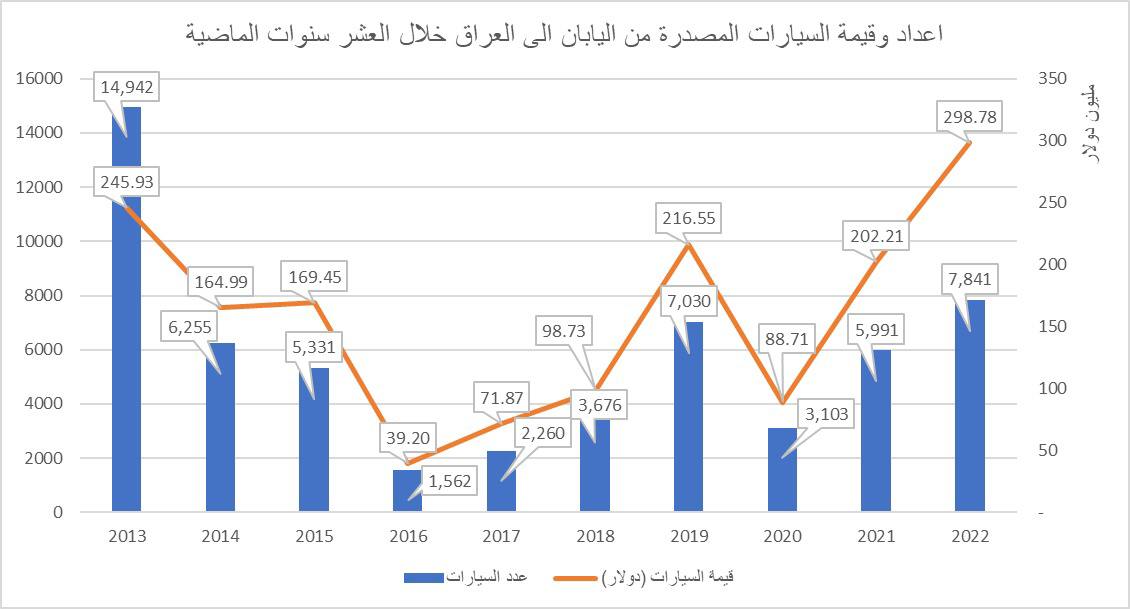 وقال العبيدي في منشور على صفحته إن "الصادرات اليابانية من السيارات الى العراق حققت اعلى قيمة لها في سنة 2022 على امتداد عشر سنوات ماضية حيث بلغت قيمة الصادرات اليابانية من السيارات الى العراق اكثر من 298 مليون دولار وبواقع 7841 سيارة".