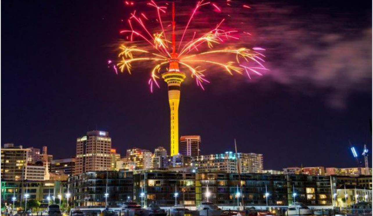 في مدينة أوكلاند بنيوزيلندا – التي تُعد من أوائل المدن في العالم توقيتاً لدخول العام الجديد – أضاءت ألعاب نارية رائعة سماء المدينة انطلاقًا من برج سكاي تاور، أبرز معالم المدينة، وسط حضور كبير من السكان والسياح الذين تجمعوا للاحتفال بقدوم العام الجديد. وشهد العرض إطلاق آلاف الألعاب النارية المتزامنة مع عروض ضوئية على البرج، مما جعل أوكلاند واحدة من المدن الرائدة عالميًا في استقبال العام الجديد. كما شملت الاحتفالات عروضًا فنية ومهرجانات شعبية في مختلف المناطق، بينما ألغيت بعض الاحتفالات الصغيرة في الشمال بسبب توقعات بوجود أمطار وعواصف.