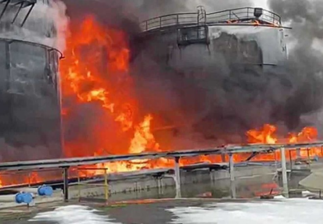 وبحسب المسؤول، فإن القصف تسبب باندلاع حريق في مستودع النفط، ووقعت انفجارات قوية في الترسانة نتيجة الهجمات.