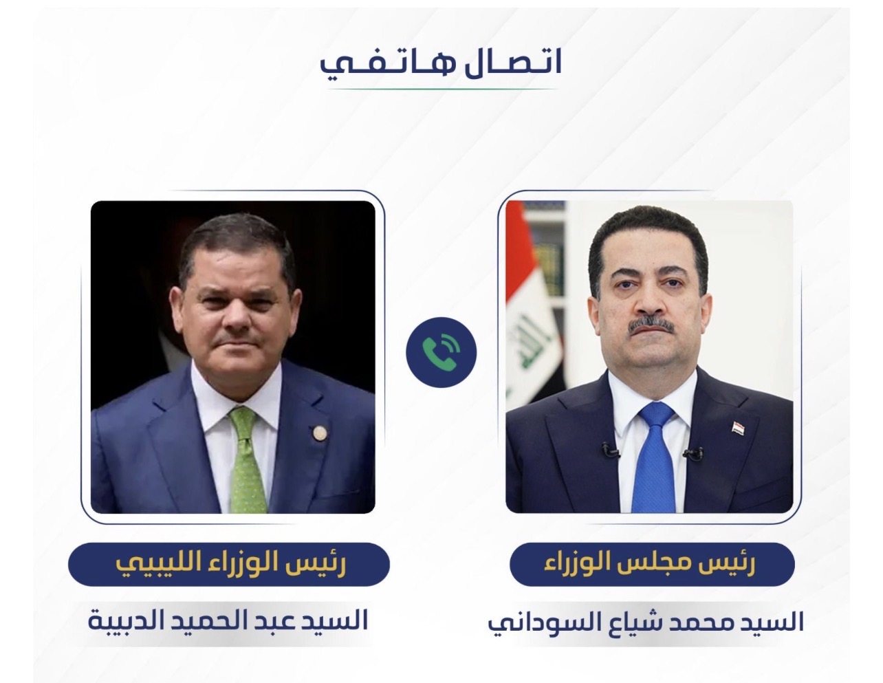 وذكر المكتب الإعلامي لرئيس مجلس الوزراء في بيان أن "رئيس مجلس الوزراء محمد شياع السوداني، تلقى اتصالاً هاتفياً من رئيس الوزراء الليبيي عبد الحميد الدبيبة".