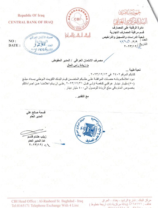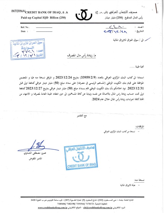 وبحسب بيان صادر عن مصرف الائتمان العراقي، فقد قام بنك الكويت الوطني بسداد مبلغ 50 مليار دينار بتاريخ 27 ديسمبر 2023، كدفعة أولى تحت حساب زيادة رأس المال، وذلك بالأصالة عن نفسه ونيابة عن كافة المساهمين.
