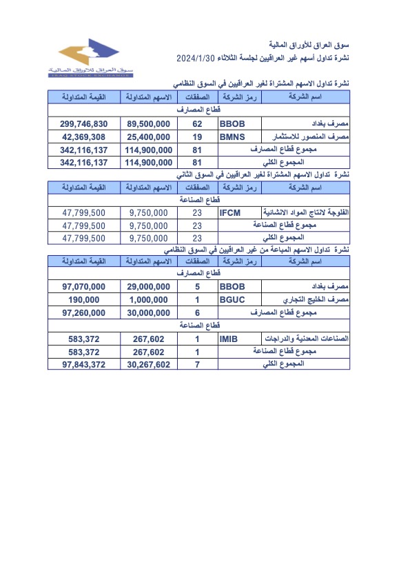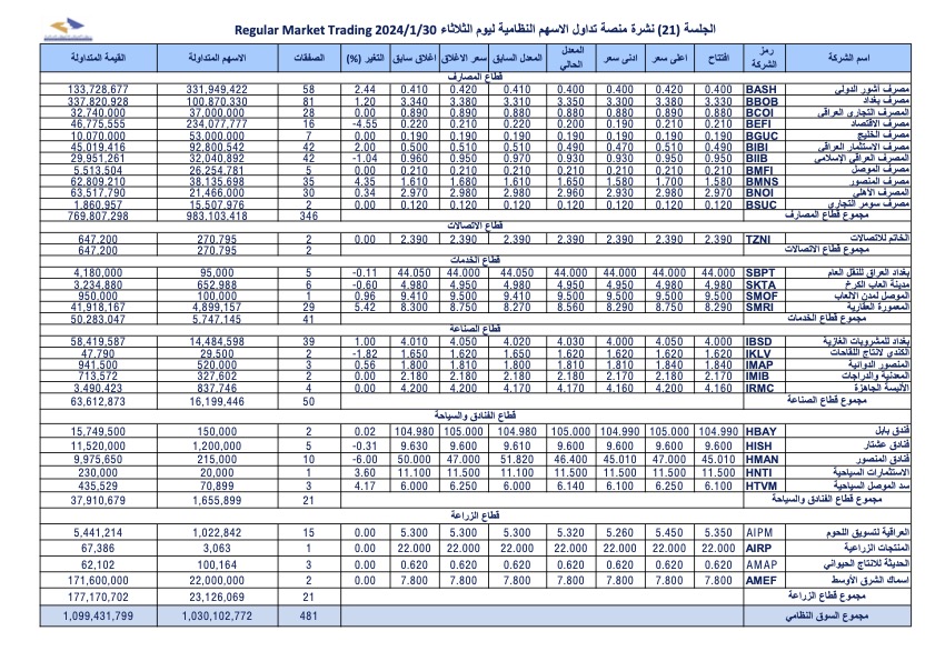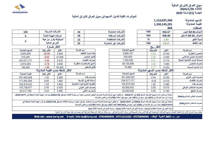 أغلقت البورصة العراقية مرتفعة بنسبة 1.07٪، اليوم الثلاثاء، بعد الدعم الكبير الذي تلقته من اسهم المصارف والعقار.