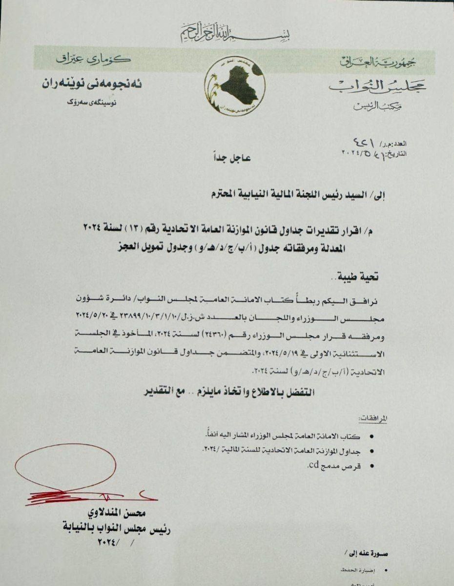 وبحسب وثيقة صادرة من المجلس أطلعت عليها "الاقتصاد نيوز"، فأن "رئيس مجلس النواب بالنيابة محس المندلاوي احال جداول قانون الموازنة العامة الاتحادية 2024 إلى اللجنة المالية النيابية".