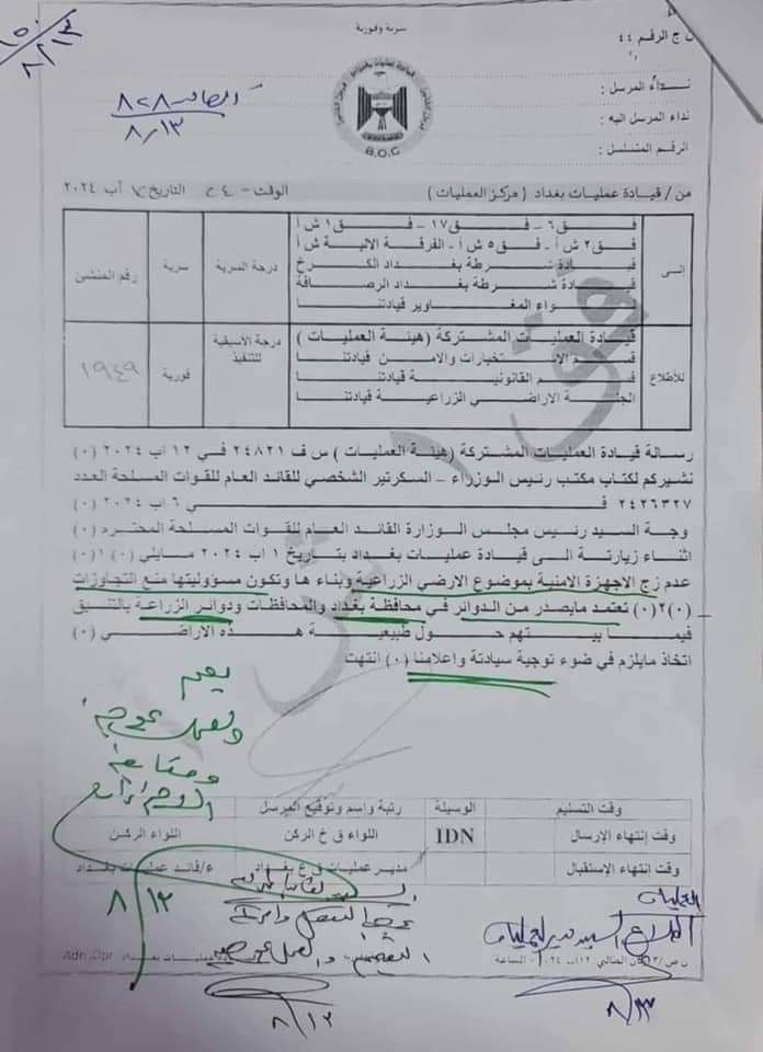 وبحسب وثيقة صادرة، أطلعت عليها "الاقتصاد نيوز"، فإن "السوداني وخلال زيارته الى مقر قيادة عمليات بغداد، وجه بعدم زج الأجهزة الأمنية بموضوع الأراضي الزراعي وبناءها".