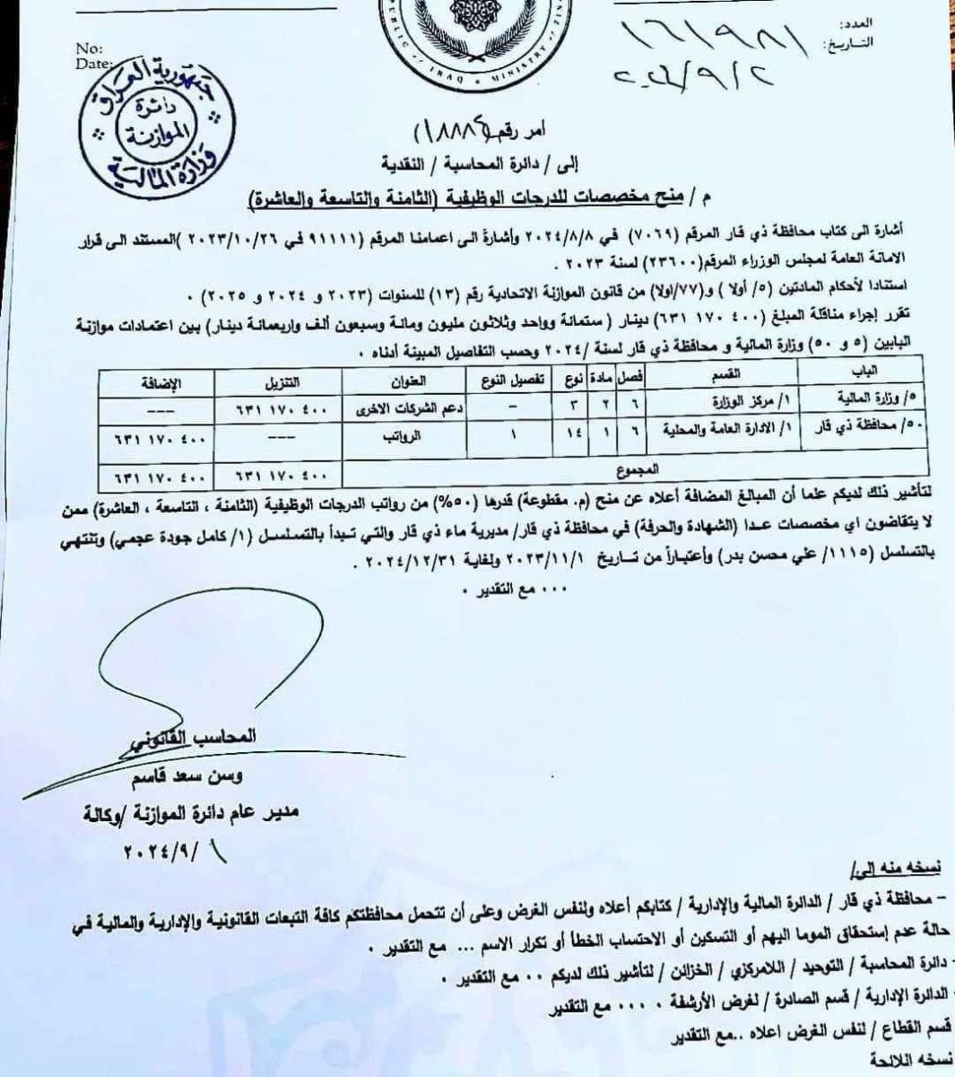 وجاء في وثيقة للوزارة اطلعت عليها "الاقتصاد نيوز"، انه "تم الموافقة على صرف مخصصات الـ 50% للدرجات الوظيفية (الثامنة والتاسعة والعاشرة) وبأثر رجعي".
