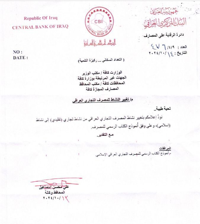 وبحسب وثيقة صادرة عن البنك المركزي، حصلت عليها الاقتصاد نيوز، فإنه "نود اعلامكم بتغيير نشاط المصرف التجاري العراقي من نشاط تجاري (تقليدي) الى نشاط (اسلامي)، وعلى وفق انوذج الكتاب الرسمي للمصرف.