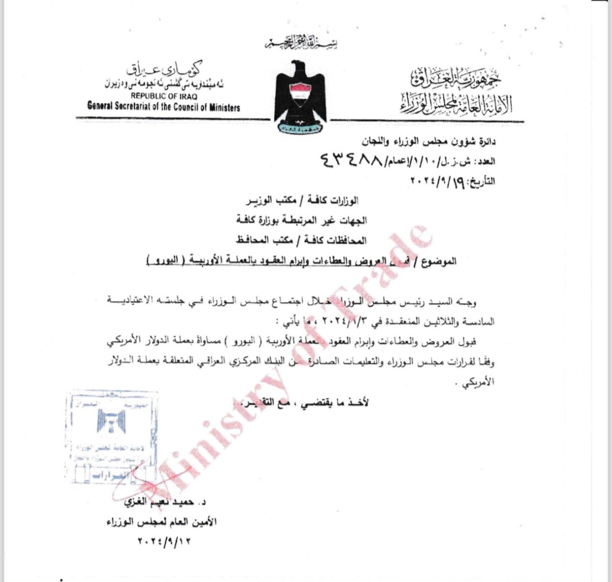 وقال الأمين العام لمجلس الوزراء، حميد الغزي، في كتاب صادر الى مؤسسات الدولة، إن السوداني وجه بقبول العروض والعطاءات وابرام العقود بالعملة الاوربية "اليورو"، مساواة بعملة الدولار الأمريكي وفقا لقرارات مجلس الوزراء والتعليمات الصادرة عن البنك المركزي العراقي المتعلقة بعملة الدولار الأمريكي.