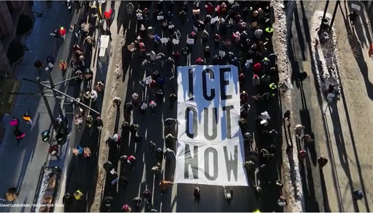 احتشد آلاف الأشخاص في وسط مدينة مينيابوليس للاحتجاج على حملة مكافحة الهجرة في المدينة، حيث تحدّت الحشود الغفيرة درجات الحرارة المنخفضة وهتفوا: "شوارعنا لنا!" وفي لوس أنجلوس، الواقعة في منتصف البلاد، احتشد الآلاف في وسط المدينة بالقرب من المكان الذي مثل فيه دون ليمون، المذيع السابق في شبكة "سي أن أن"، أمام المحكمة بتهمة انتهاك القانون الفيدرالي أثناء تغطيته لاحتجاجات 18 كانون الثاني في كنيسة بمدينة مينيابوليس.