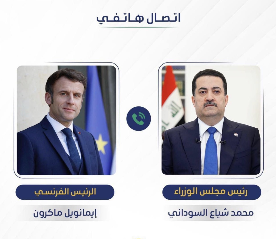 وذكر المكتب الإعلامي لرئيس مجلس الوزراء في بيان، أن "رئيس مجلس الوزراء محمد شياع السوداني، تلقى اتصالًا هاتفيًا من الرئيس الفرنسي إيمانويل ماكرون، جرى خلاله مناقشة التطورات الأمنية وتداعياتها على أمن وسيادة دول المنطقة".